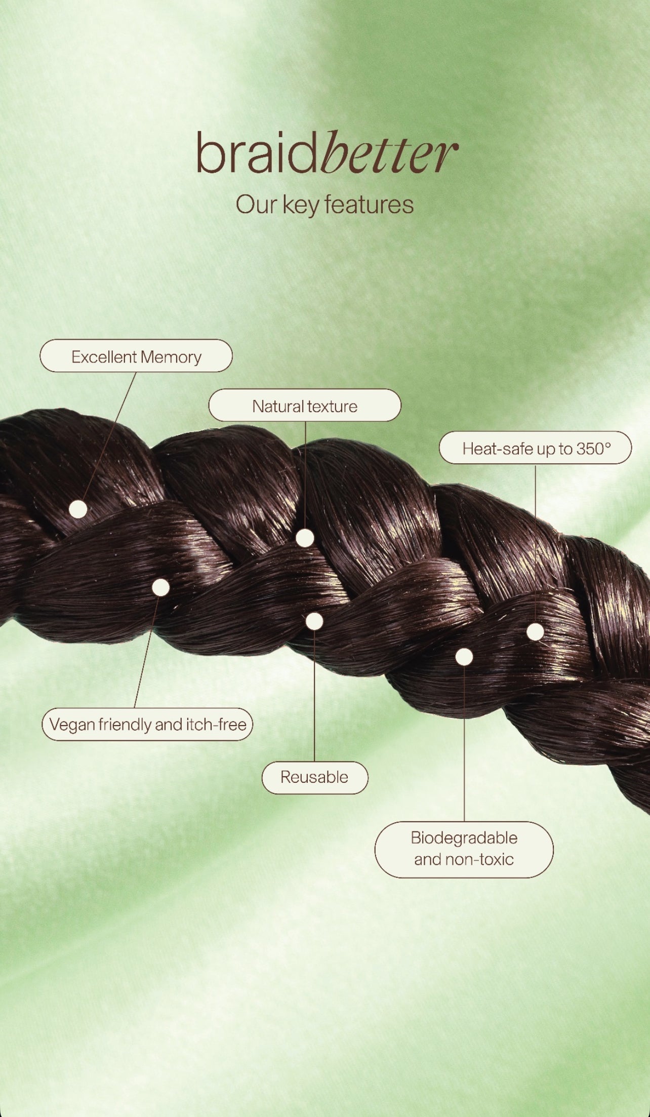 Experience guilt-free, itch-free braiding with BraidBetter by REBUNDLE. The vegan and biodegradable formula, lightweight texture, and non-slip handle make braiding easy and environmentally-friendly. Withstand up to 350°F without frizz with the first U.S. plant-based, biodegradable braiding hair. Try BraidBetter for sustainable and stylish protective styling.